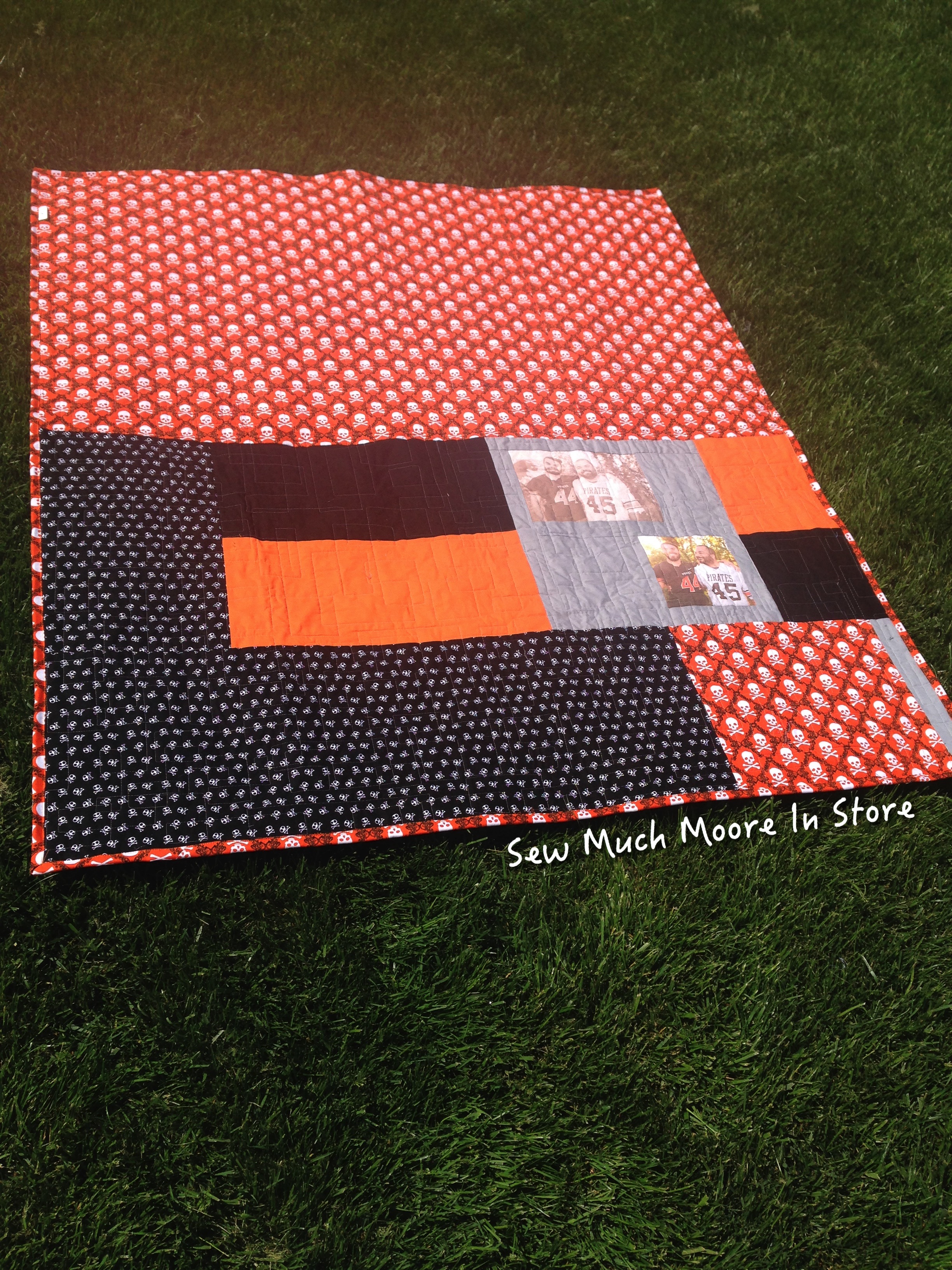 Heather wanted to have a quilt that could be signed at the graduation party, but could also be used as a lap-quilt. Heather had some digital pictures to incorporate into the quilt. The colors picked were the school colors: orange and black. I also used some white and grey so it wouldn’t look like a Halloween themed quilt.