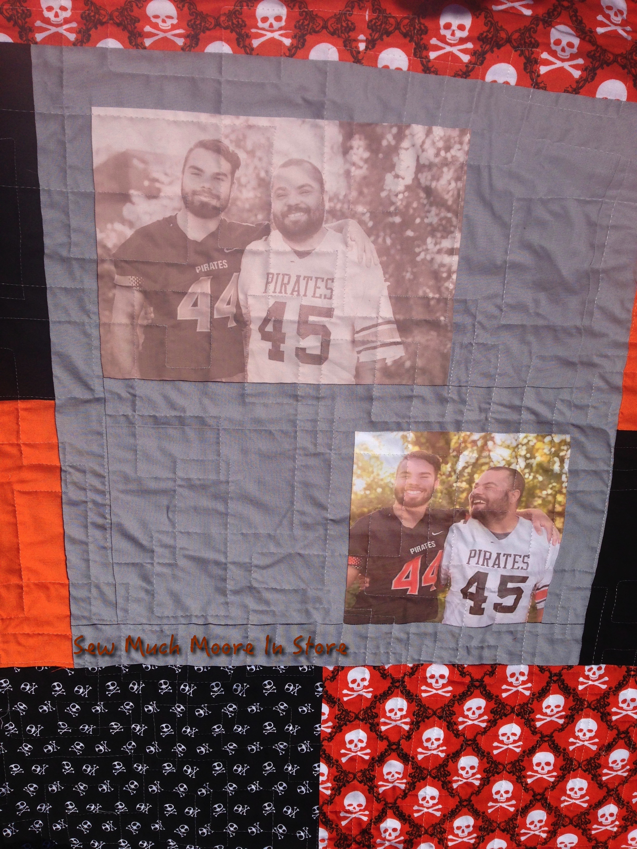 As I mentioned before, Heather provided some digital pictures of her nephew and late brother to incorporate into the quilt. I originally thought I would insert the pictures into the front of the quilt, but the symmetry of the “Floating Squares” would have been compromised. I decided to improvise the back, while utilizing both pictures. Instead of using strictly solids, we chose to incorporate fabrics that personified the High School Mascot – The Pirates. Here are the 2 fabrics we decided upon: