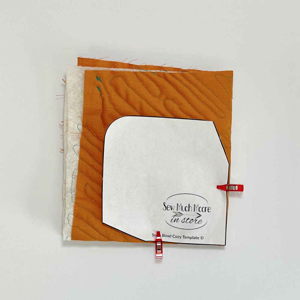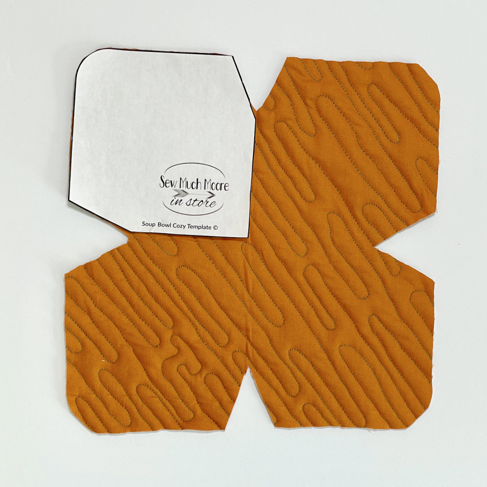 To get started, you’ll need two quilt sandwich squares, each at least 11” x 11”. These will become the pieces for your bowl cozy. If you don’t have any free motion quilt samples, create your own by quilting two pieces of fabric. Make sure to sandwich the batting between them. You will also need the Free Bowl Cozy Template.