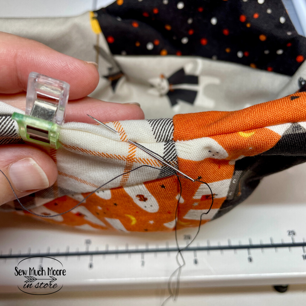 To finish the project, fold the raw edges of the opening inward and pin in place. You can either top stitch around the entire edge to close the opening or hand stitch it closed using a whip stitch. I prefer to hand stitch for a more seamless finish, but the choice is yours.