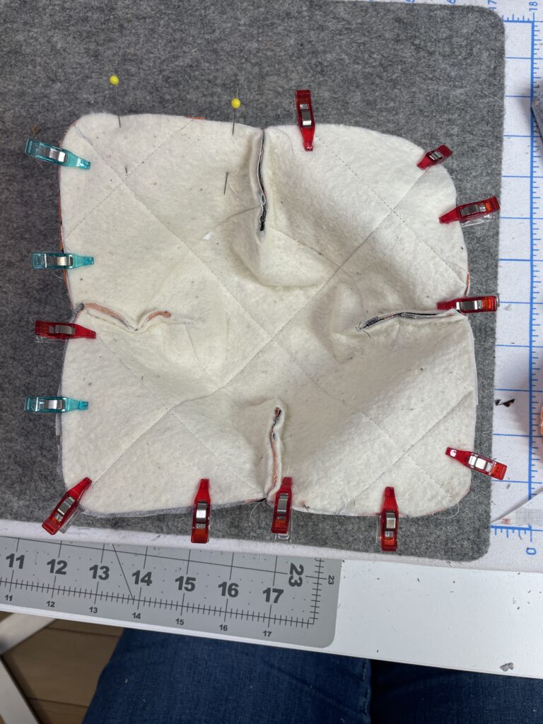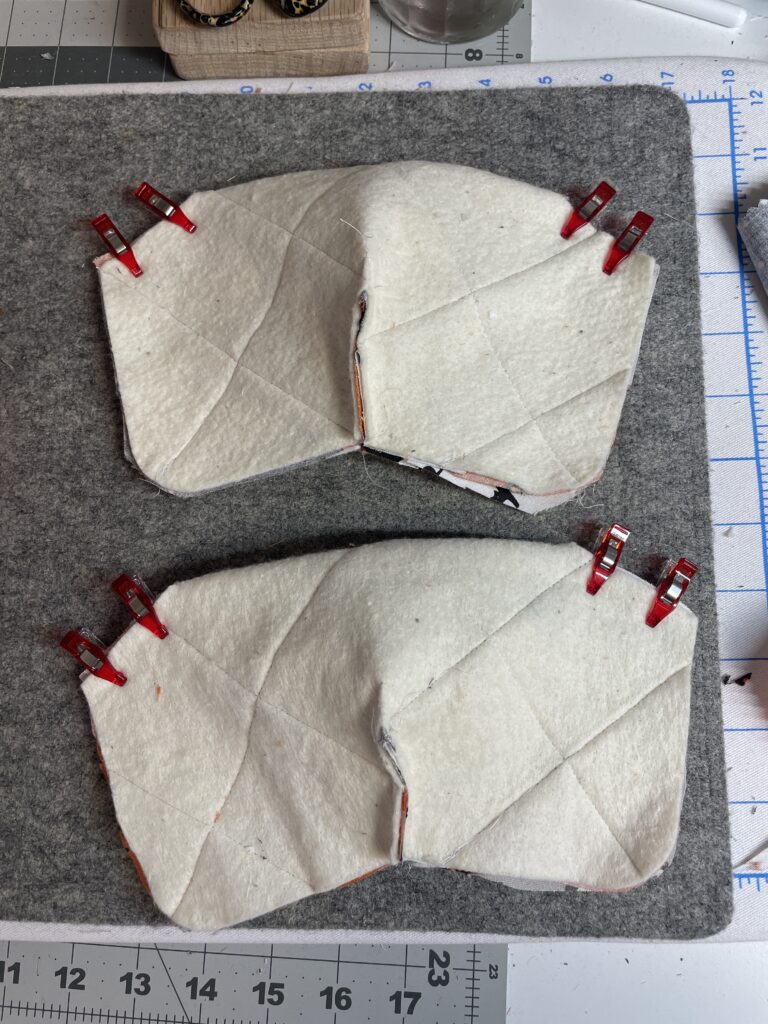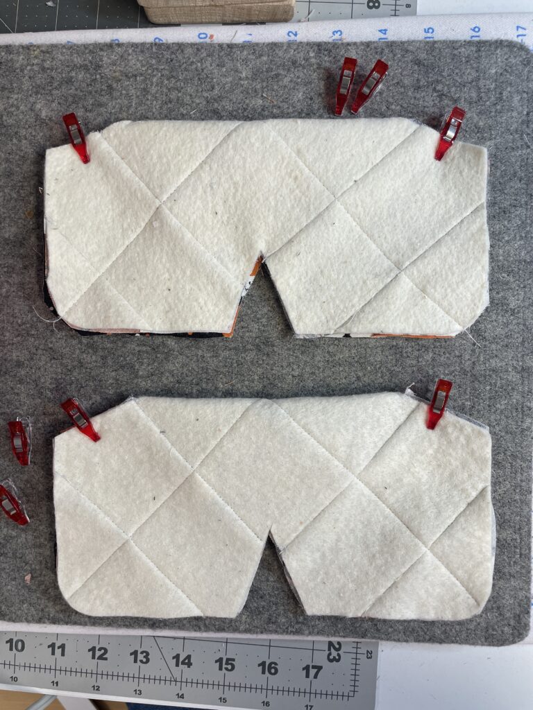 Now that the fabric and batting are prepared, fold the bowl cozy in half (right sides together) so that the darts match up. Use wonder clips to keep everything aligned. Sew the darts closed, backstitching at the beginning and end for extra durability.