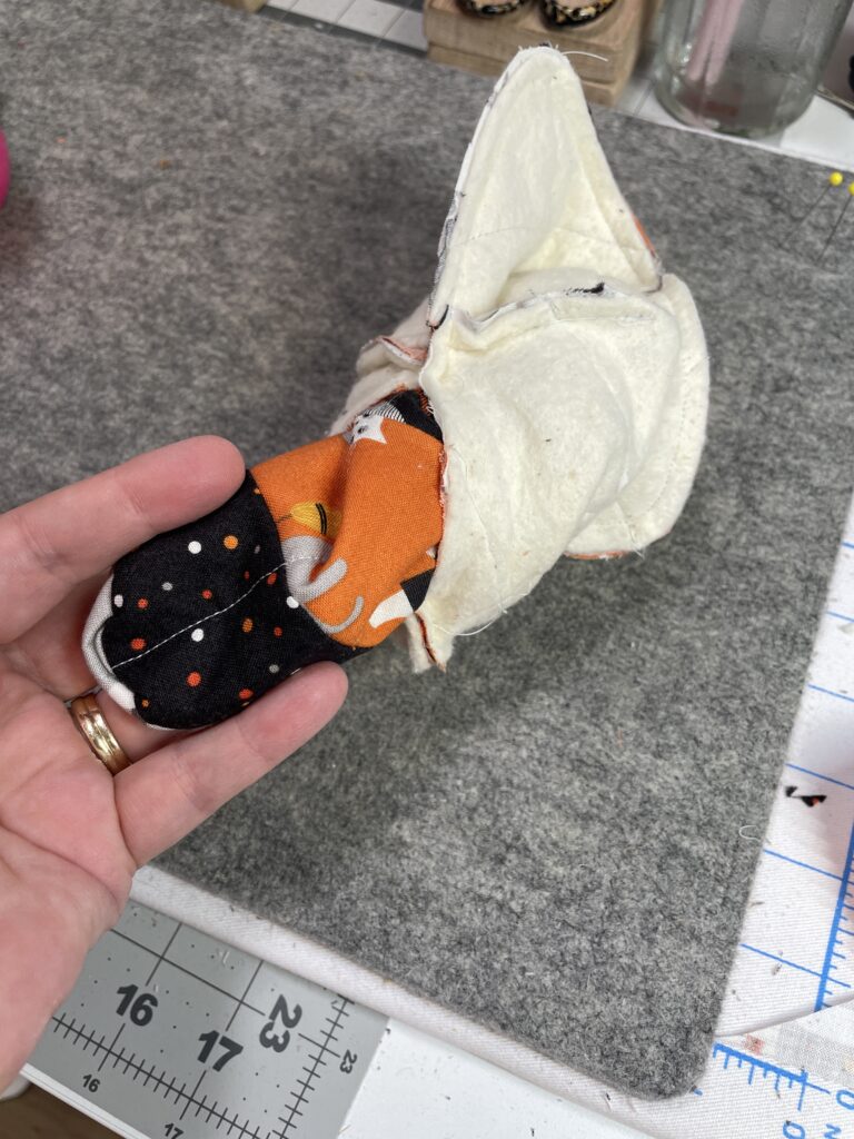 Carefully turn the bowl cozy right side out. Use a chopstick or other pointed tool to gently press the seams out. This step ensures that your cozy looks neat and professional.