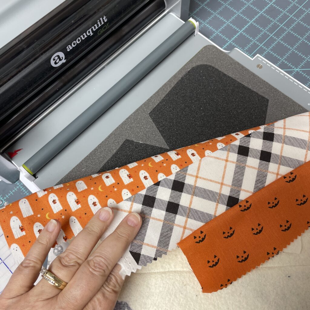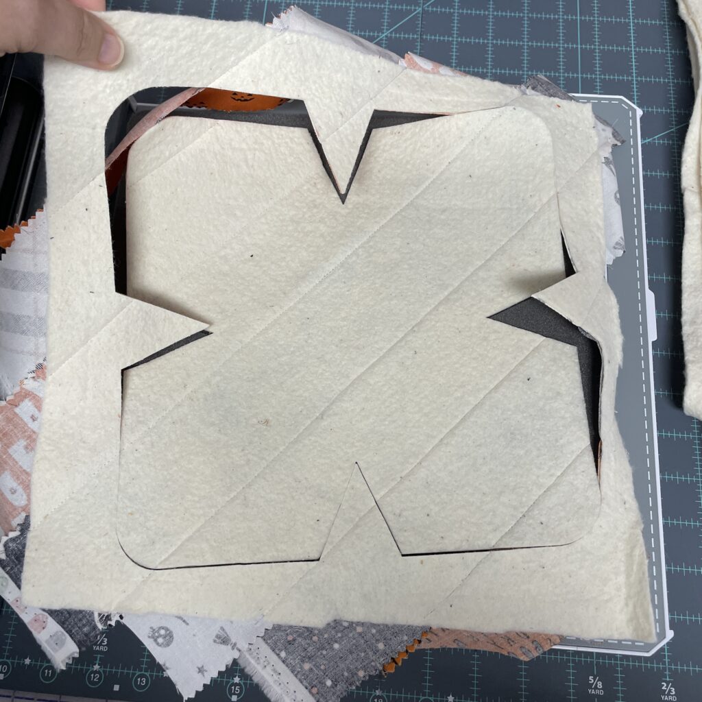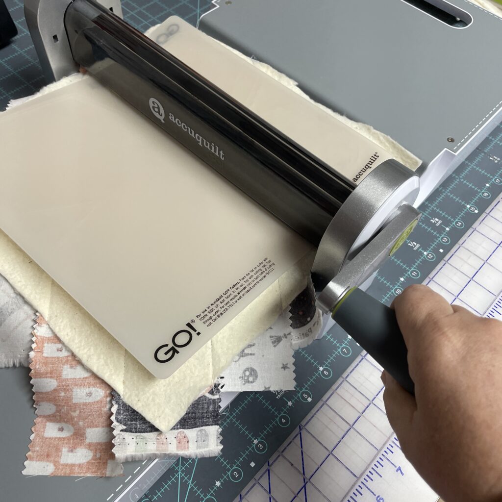 Place your prepared batting square on the appropriately sized AccuQuilt die. Next, position the cutting mat on top and run it through your AccuQuilt Cutting System. Repeat this process for both the interior and exterior pieces of the cozy.