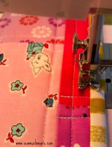 After installing the binding, I lined up the front and the back panels. Placing them right sides together, I sewed them up using a 1/4″ seam allowance and returning with a tight zig zap all the way around the perimeter of the pillow cover. I gave the envelope opening points a few more passes with the needle and thread to ensure the pillow would stay together nicely.