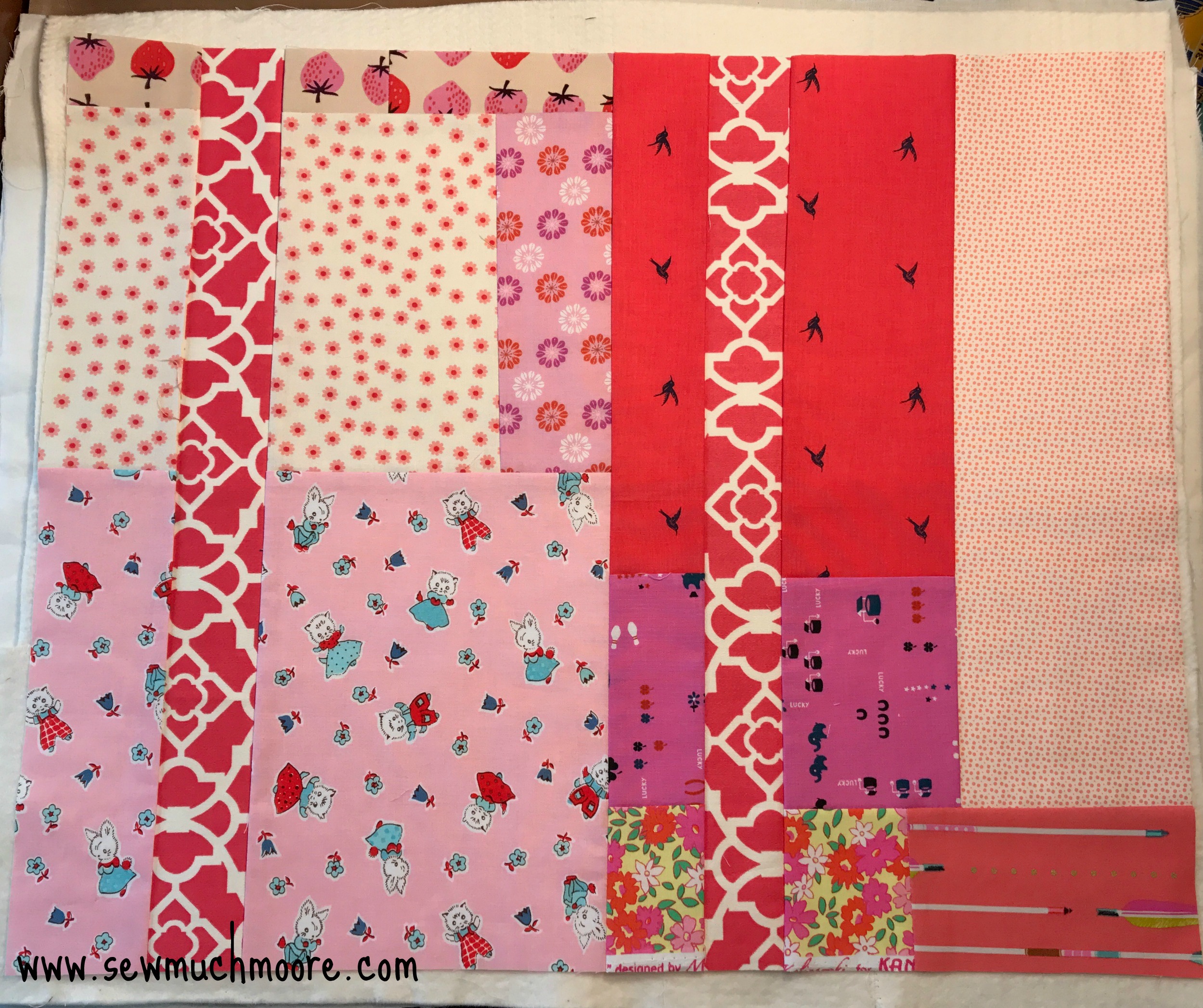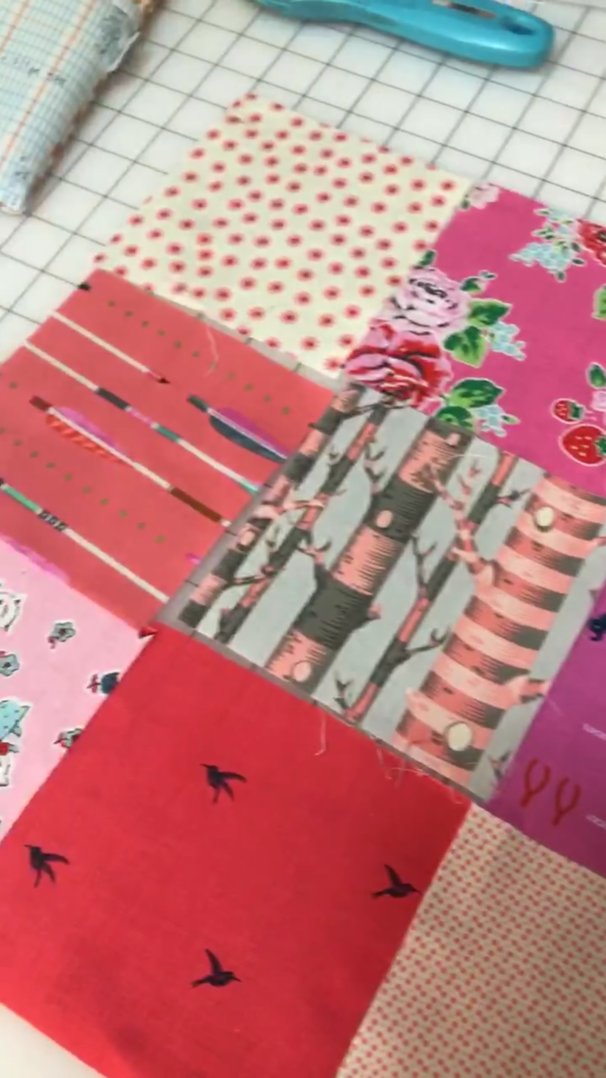 Needless to say, I had several scraps to choose from! After auditioning several choices, I decided on a few of my favorites for my scrappy nine patch throw pillow! I have a fair assortment of Cotton & Steel, Tula Pink, & Elea Lutz plus several others as well. I was only pulling from my Red, Orange and Yellow scrap bin, so most of the scraps seemed to play well together.