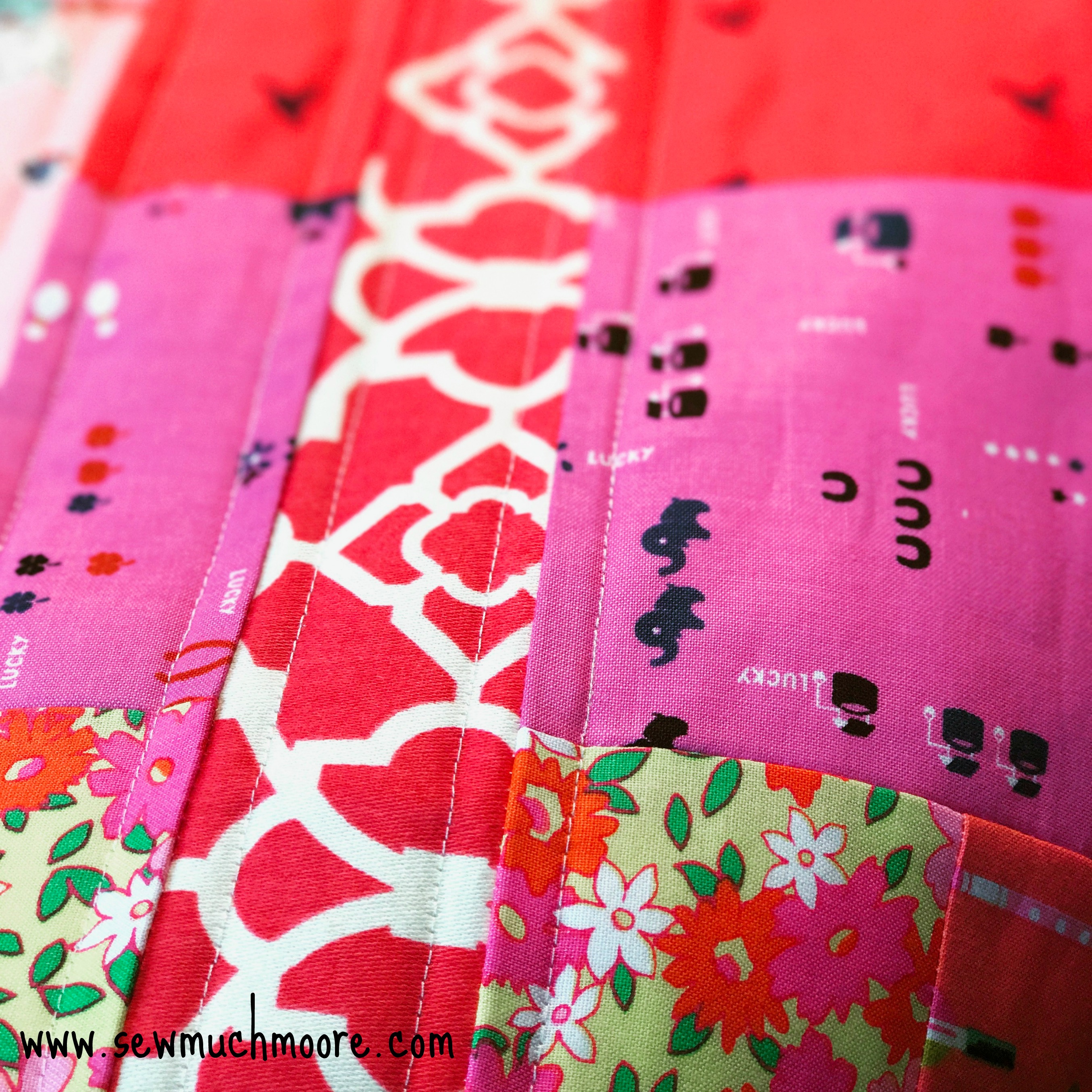I made some minor changes in the final layout of the pillow front. I tried to balance the lights and darks, but in the end – I think this random layout worked out just fine! I added a contrasting border to make the pillow top the correct size for a 20″ x 20″ pillow form. I sandwiched this all between some really great batting (I love Quilter’s Dream Supreme) and backed it with some muslin I had left over from a mock costume I made a couple years ago. I added some simple straight line quilting. Such a cute and simple pillow top!